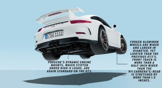 As always, the GT3 is distinguished by larger front atmosphere intakes to supply the air conditioning necessary for prolonged track use—Porsche promises that 80 percent of GT3s spend some time at the racetrack.